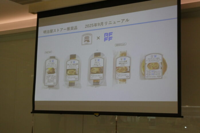 発表会では、冷凍食品事業での「共創」の取組として、明治屋ストアー推奨商品として、明治屋とロック・フィールド「RFFF(ルフフフ)」とのダブルブランド商品5品の9月発売、10月中旬発売のギフト商品も披露されました。