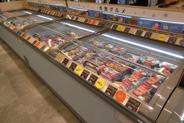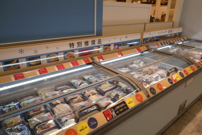 ショーケースは温室効果ガス削減を配慮した自然冷媒タイプで15台。450品のうち、アイス・冷凍スイーツ120品(ご当地アイスは66品あります)、冷凍食品330品で、うちご当地冷凍食品65品、外食ブランド冷凍食品45品と充実しています。