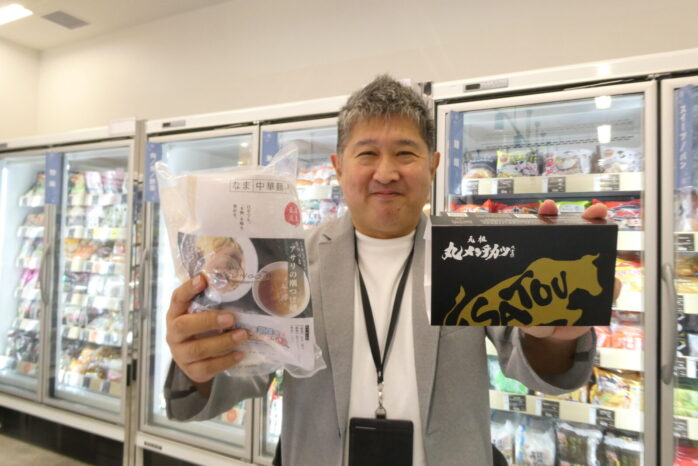 吉野部長が右手に持っているのは、人気商品「紙包みハンバーグ」。左手には、今回初導入のご当地冷凍食品、吉祥寺の行列ができるメンチカツ・冷凍版「吉祥寺さとう 元祖丸メンチカツ」(レンジ調理、2個入)です。同メンチカツは、さとうの公式オンライン以外で初の販売。定番ではなく契約数量限定発売です。