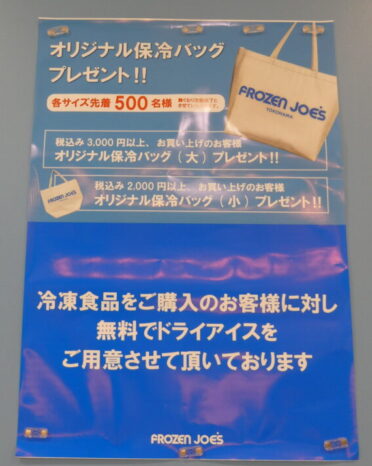 新店ではオープンを記念して保冷バッグプレゼント(大小各500名)を実施しています。お近くの冷凍食品ファンはお早めに♪
