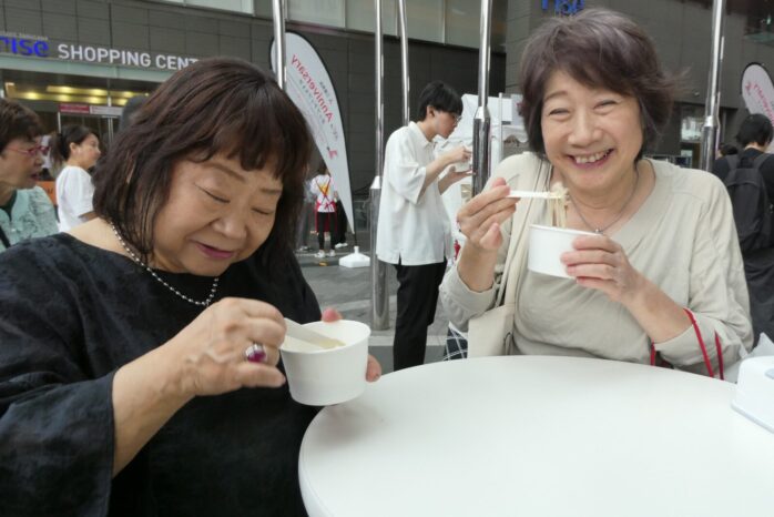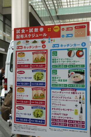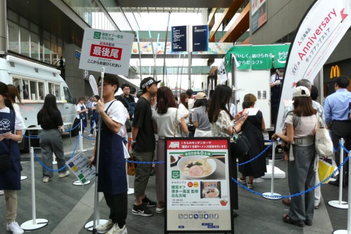 二子玉川ライズで開催中の三菱食品100周年アニバーサリー・ポップアップストア(9月12日~14日)の無料試食風景です。キッチンカー2台で、三菱食品のオリジナルブランド食品を調理して試食提供。ワイン・チューハイ5種セットの試飲も行っています。写真は初日お昼の糖質オフラーメン「からだシフト 博多一風堂 白丸元味」の試食配布風景。今年秋の新商品です。