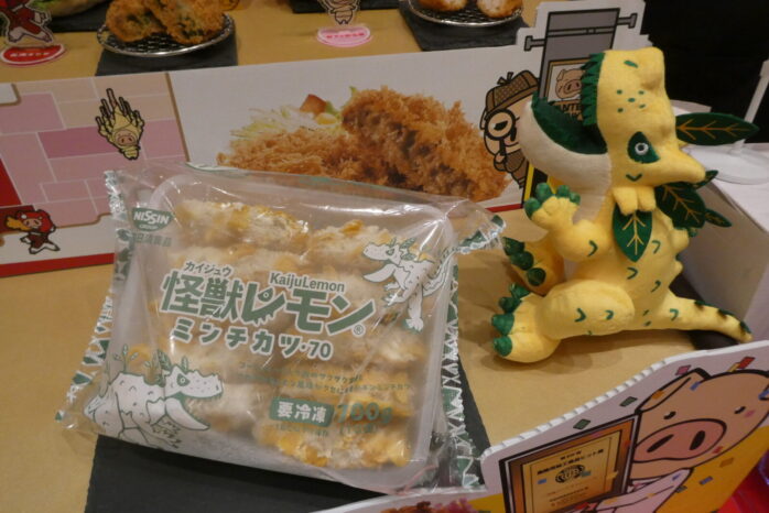 四国日清食品は「ご当地メンチカツシリーズ」で受賞。この「怪獣レモンミンチカツ」は、ごつごつ不格好に大きく育ちすぎて市場流通できなかった瀬戸内レモンを「怪獣レモン」としてブランド化されたご当地食材を使用して、日清食品グループのコーンフレークをごつごつ付けて怪獣っぽくしたミンチカツ。味わいも良し、です。