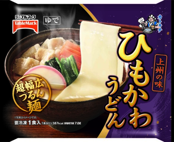 「ひもかわうどん」は、群馬県桐生地方に伝わる郷土料理。幅が約4センチの幅広ひもかわうどんは、つるつるとした食感が特長。魚介のうまみを感じるつゆ、豚肉、かまぼこ、にんじん、ほうれんそうをトッピングしています。