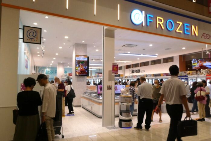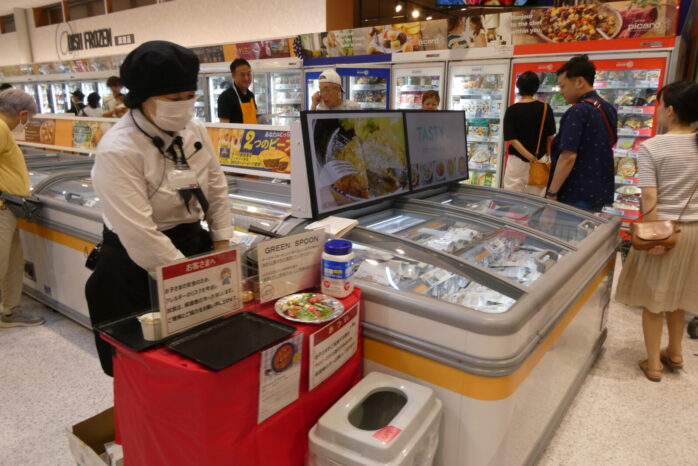 右奥のイオンスタイル店内にも当然冷凍食品売場があります。品揃えは約600品。@FROZEN の品揃えとダブるものは80品くらいあるそうです。@FROZENだけで冷凍食品を買うお客様の便利さを考えてのことだそうです。