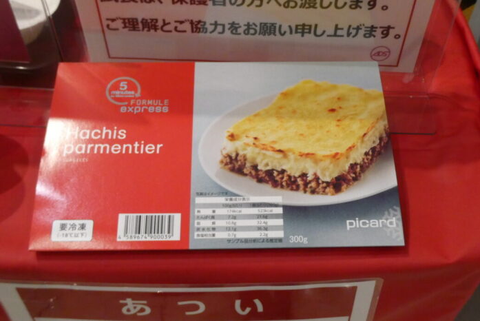 「牛ひき肉のパルマンティエ」の試食。ピカールの仕様に基づいて国内製造しているディナーメニューです。レンジで手軽においしく食べられる入門編として試食紹介をしていました。