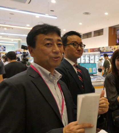 オープンにあたっての取材会で説明したイオンリテール青木郁雄デイリー商品部長㊧、奥はイオンサヴール橋田宏店舗営業部長。