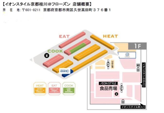 @FROZEN 見取り図。イオンスタイル店舗の図・右下の2階がJR桂川駅につながっています。駅前から周辺にマンション、住宅がたくさんあって、人口増加中の地域です。