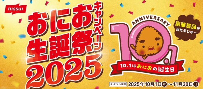 ニッスイは家庭用冷凍食品「大きな大きな焼きおにぎり」の公式キャラクター「やき おにお」の誕生日(2009年10月1日)に合わせたプレゼントキャンぺーン「おにお生誕祭キャンペーン2025」を10月1日からスタートします(11月30日まで)。