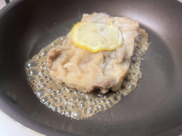 まずは、凍ったままのレモンステーキをフライパンにブチ込む!