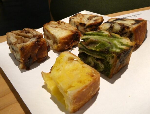 発表会の試食商品で説明すると、㊧上から時計回りに、濃厚なチョコレートペーストと砕いたチョコの「オリジナルバブカ」、エルビス・プレスリーが好きだったサンドイッチ、いわゆるエエルビスサンドをイメージしたオリジナルバブカとして、ピーナッツバター、イチゴジャム、バナナペースト、ローストしたベーコンを使った「エルビスバブカ」、密漬けりんごとチョコ、シナモン使用の「アップルシナモンバブカ」、コーヒーフィリングに砕いたビターチョコを練り込んだ「ジャバチップバブカ」、抹茶とあずきホワイトチョコレートを使用した「抹茶あずきバブカ」、レモンとホワイトチョコを使用、レモンピールのほろ苦さも感じる「レモンバブカ」。