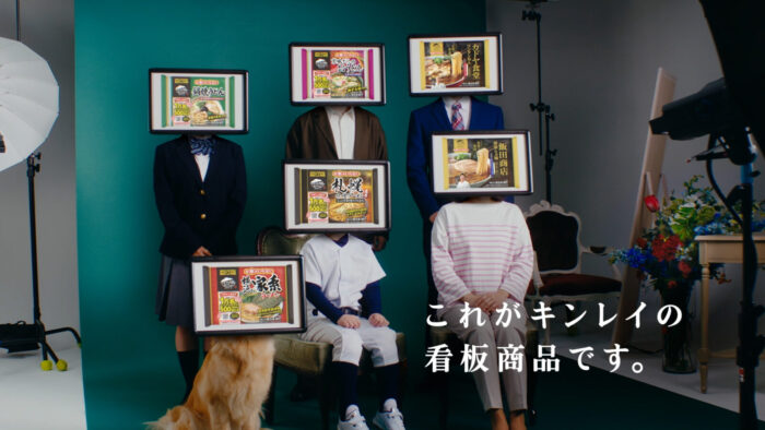 キンレイTVCM「キンレイの顔」篇は、なんともシュールな5人と1匹ファミリーの顔がキンレイの看板商品