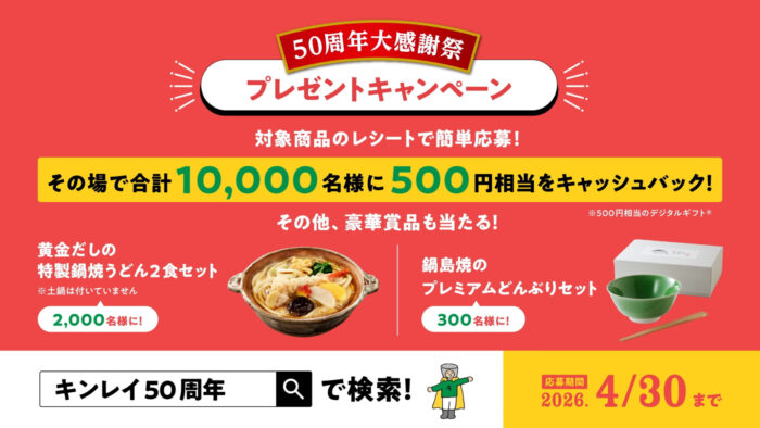 キンレイの創立50周年を記念した大感謝祭プレゼントキャンペーンは、対象商品の購入レシート(2025年8月19日~2026年4月30日)によってポイントを貯めて応募します。