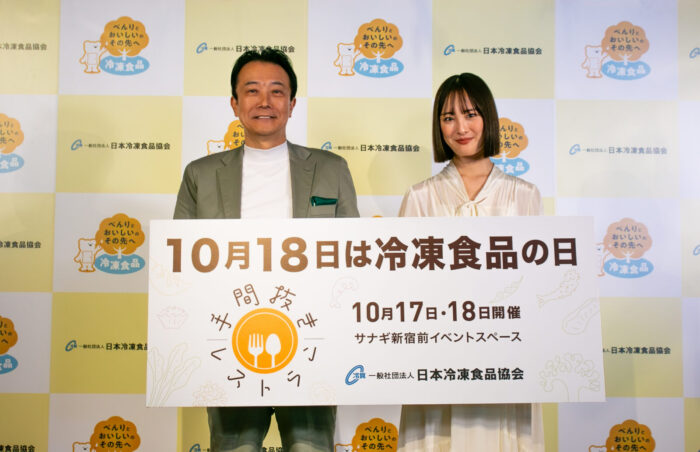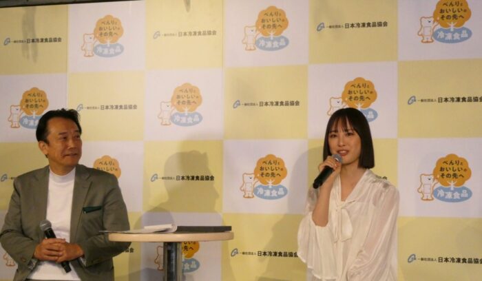 日本冷凍食品協会(冷食協)の藤江太郎会長㊧、「手間抜きレストラン」イベントPRゲストの大友花恋さん㊨。