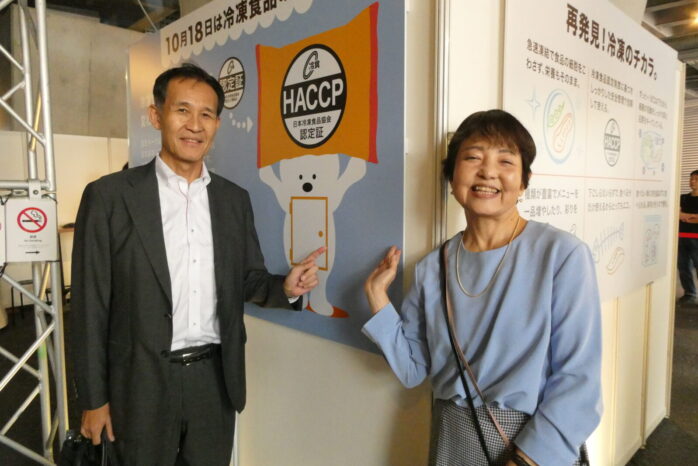 冷食協主催の屋外での試食イベントは2年目。楽しみに足を運んでくれた方々を確認して「ありがたい。嬉しいなぁ」と出倉功一専務理事。今年デザインが改定された、冷食協・認定証マークの紹介パネルの前で、三浦佳子広報部長と記念ショットをいただきました。レストラン形式にサーブしたのは、「できたてのメニューを味わっていただきたいから」(三浦部長)とのことでした。