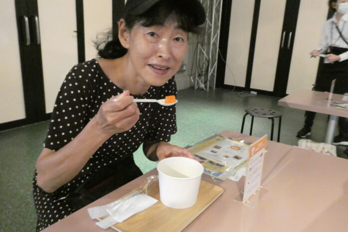 一番乗りの方は、近隣にお住まいの挽地さん。「スマートニュースでイベントを知りました。冷凍食品はよく利用するので気になって、近所なので参りました」とのこと。夕食メニューの「ポトフ風 具だくさんスープ」をオーダーして、「お野菜もおいしい!!?水餃子とお弁当用のハンバーグなんですか!」とニコニコ、びっくりされていました。