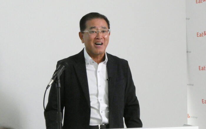 ㈱イートアンドホールディングスの2026年2月期の第2四半期(上期)決算概要説明を行う仲田浩康社長です(10月10日、同社東京オフィス)。食品事業の今年度上期は、関東第一工場が復旧したことによって生産量が前年同期比109.7%、20,673トンと復活、伸長しました。