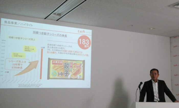 海外事業については、台湾で成功している大阪王将店舗(10店舗)と家庭用冷凍食品(Pxmart約1200店、セブンイレブン約6000店)の両輪事業によるシナジー効果を示しながら、北米における合弁事業で、2026年ロサンゼルスに外食店1号店出店予定としました。外食店出店後、西海岸から「OSAKA OHSHO GYOZA」の販売を計画しています。