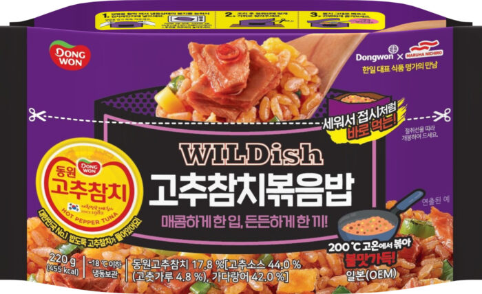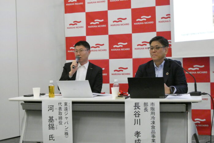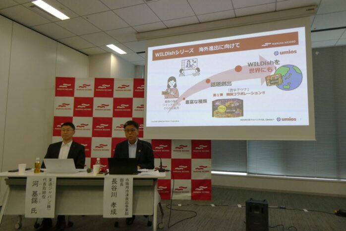 マルハニチロは10月22日、東京・豊洲の同本社会議室で家庭用米飯『WILDish』シリーズで韓国版「唐辛子ツナ炒飯」の韓国での発売(11月からDongwonが輸入販売)を記念して、12月から同じ味付けの製品の国内販売(オンラインで数量限定)を発表しました。写真は発表会に出席した、東遠(Dongwon)ジャパン㈱の河基錫(ハ・キソク)社長㊧とマルハニチロの長谷川孝成市販用冷凍食品事業部長㊨。手にしているのは韓国発売商品と9月に全国発売したコラボ第一弾商品。