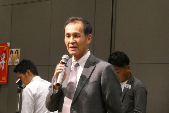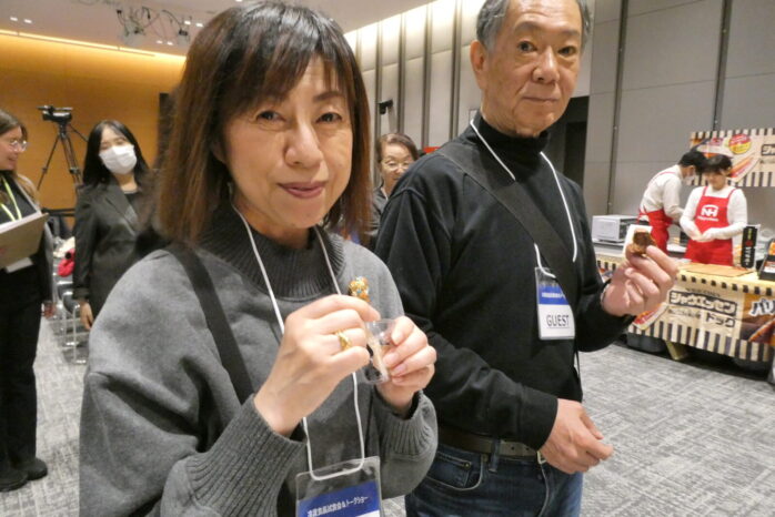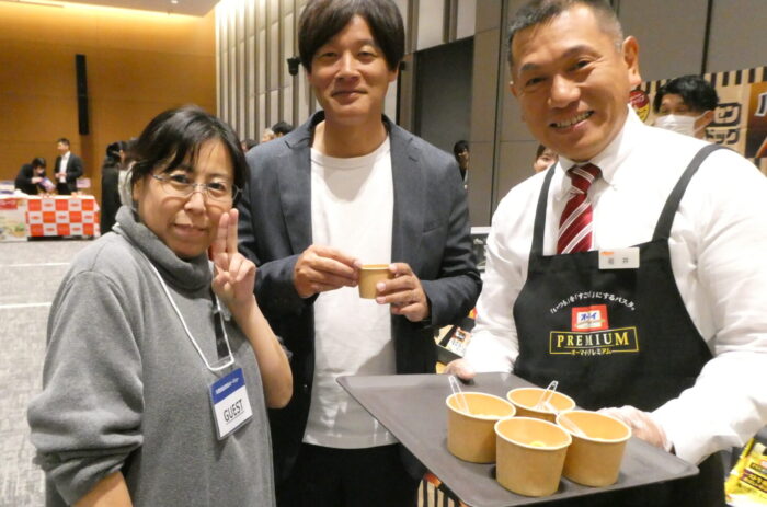 「え!嬉しいなぁ」とニップン岩井さん㊨もニコニコ。鎮目会長㊥に「抽選で選んでくれてありがとうございます。ハガキに熱意を感じていただけましたか?」。鎮目会長も「もちろん! 抽選の時にはたくさんのハガキから熱い想いを感じました」と返事。