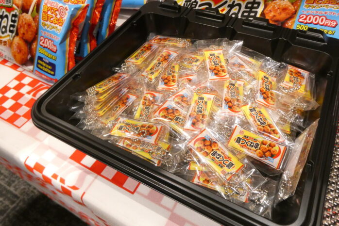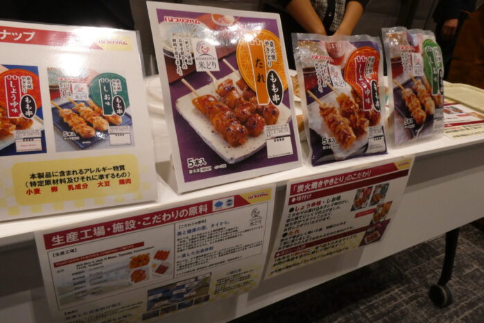 ケイエス冷凍食品は定番「国産鶏 鶏つくね串(照焼)」の試食ですが、全員に特製マスコットをプレゼント。👍