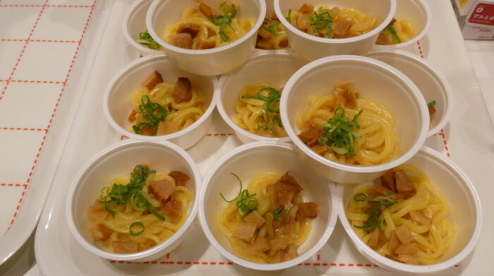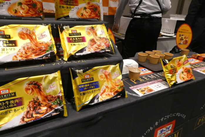 新しく知ったナンバーワンは?と聞いたら「スープパスタ!おかわりしたい」とのことだったので、ニップンの「オーマイプレミアム 至極の海老のビスク スープパスタ」のブースへ。