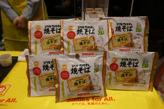 新パッケージになった東洋水産「まるちゃん 焼そば 2食パック」。豚肉、キャベツ、にんじんの具材入りで炒めて、レンジでOKのまるちゃん焼そばをPR