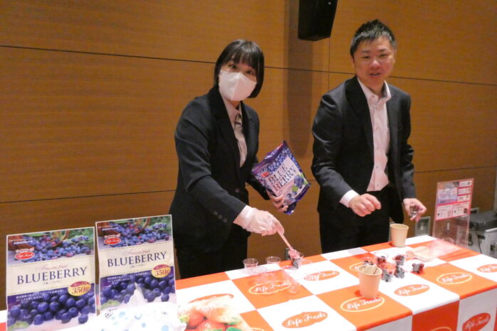 ライフフーズの「ブルーベリー350g」。いまブルーベリーは大人気。同社は昨年、あまりの人気にあっという間に試食品がなくなってしまったので、今年はしっかりたくさん用意して臨んだとのこと。目を使う(スマホ?)皆さまにとってのお助けフルーツとして定着しましたね。