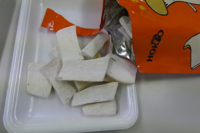まずは、食べてみてください、ということでしたので、炒めたものや味噌汁、ピザのトッピングなどを出していただいて試食。
