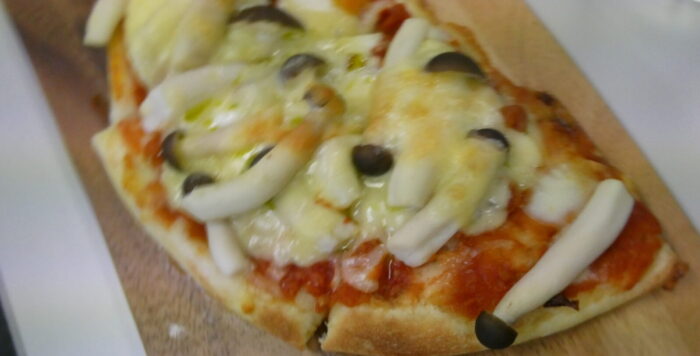 冷凍カットぶなしめじもジューシーです。なぜピザに?と聞いたら、きのこのうまみ×チーズのうまみで食べてみてほしかったとのこと。