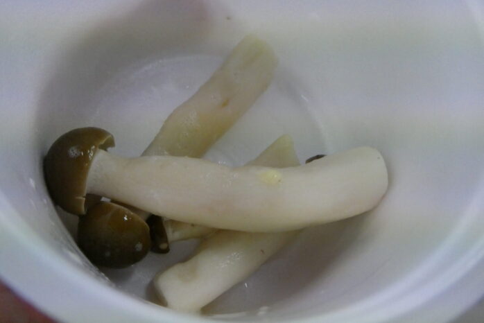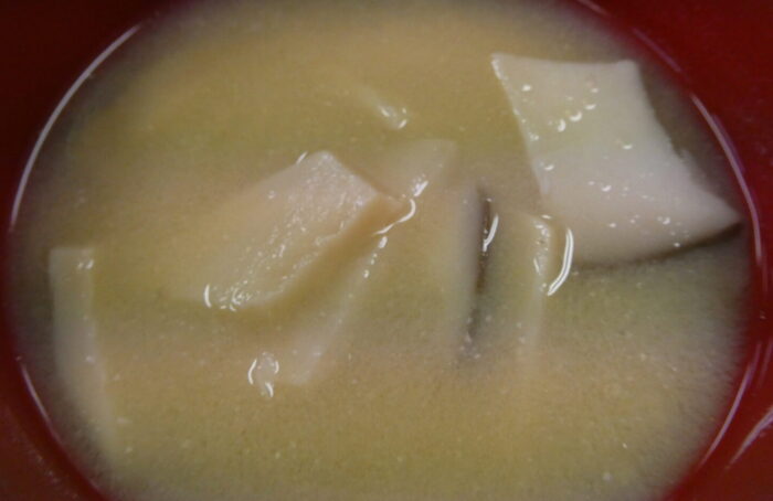 エリンギだけ入っているお味噌汁。おいしい~っすねぇと食べていたら、「だし、使ってないですよ」と言われてびっくり。味噌スープにはうまみたっぷりです。冷凍カットエリンギを水からゆでて、味噌を溶いただけの味噌汁です。