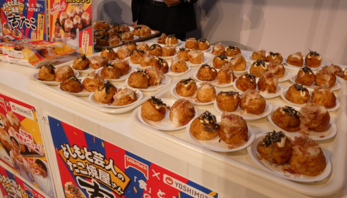 「あ、よしもとなのに、『吉たこ』のこと紹介しなくちゃ」と、よしもと芸人がメニューを考えて運営しているたこ焼チェーン「吉たこ」の冷凍食品(日本アクセス×吉本興業コラボ品)もPR。