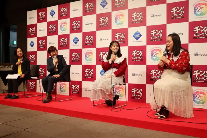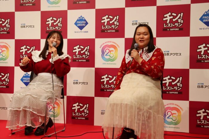 「チン!するレストラン in SAPPORO」のオープニングセレモニー、スペシャルゲストとして登壇した、よしもとお洗い芸人「ぼる塾」きりやはるかさん(はるちゃん)㊧と田辺智加さん㊨です。「毎日めちゃめちゃお世話になっています」とはるちゃん。