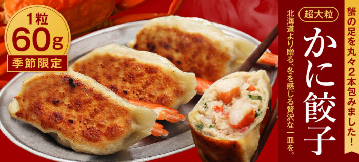 1粒60gでカニ足まるまる2本入り「超大粒かに餃子」~SAPPORO餃子製造所から季節限定発売