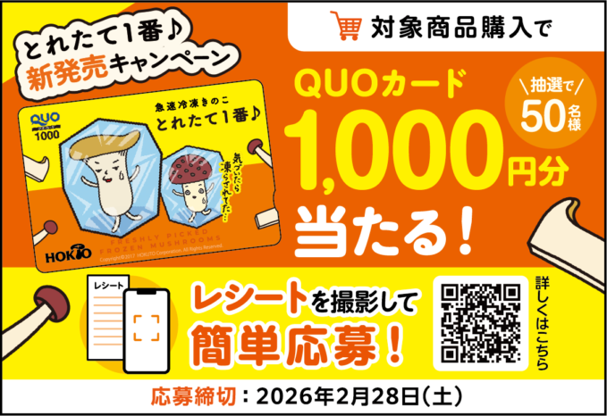 ホクト「急速冷凍きのこ とれたて1番♪」新発売キャンペーン開始(~2026年2月28日まで)