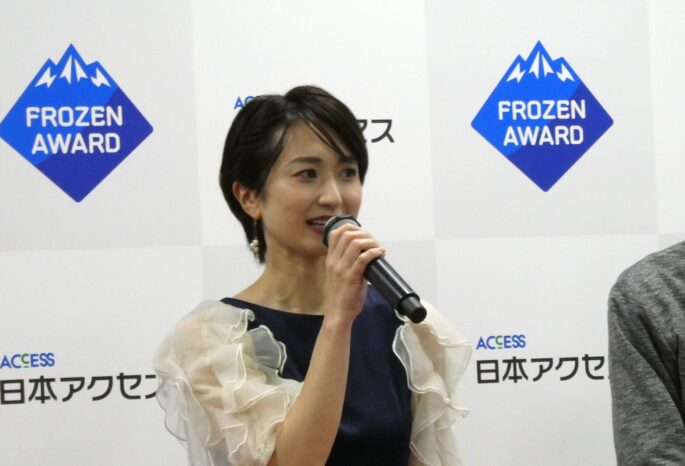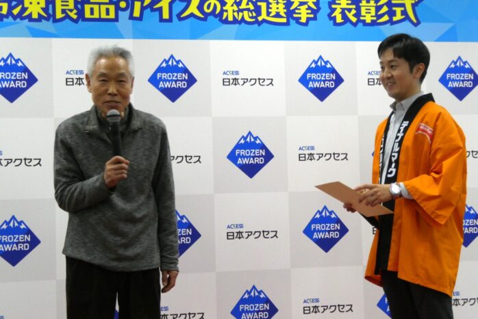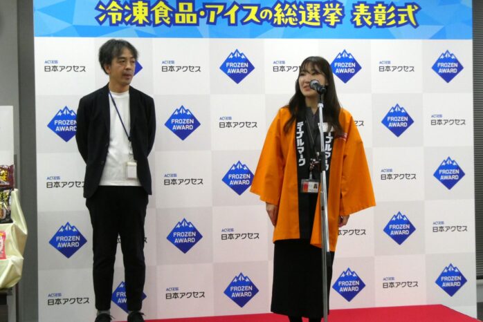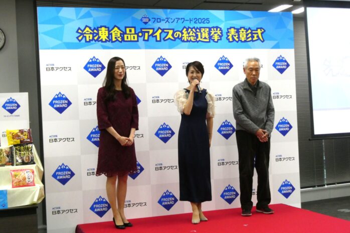 日本アクセス主催「フローズンアワード2025」表彰式・懇親会(12月11日、アクセスホール)のひとこま。キャンペーンのPR企画として制作した連続配信ショートドラマ「推しアイス戦争~アイス部、爆誕!」に出演した俳優、モロ師岡さん㊨、星乃あんりさん(元宝塚)㊥、同伶美うららさん(同)㊧が、特別ゲストとして出席。会場が盛り上がりました。