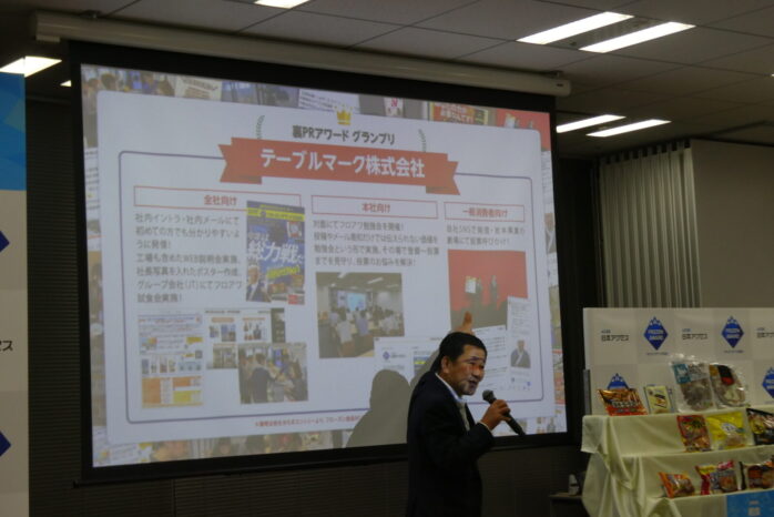 「裏PRアワードグランプリ」の発表をした日本アクセスの宇佐美文俊代表取締役副社長は、テーブルマークによる「総力戦」を社内に呼びかけた取り組みに身を乗り出して解説、高く評価しました。