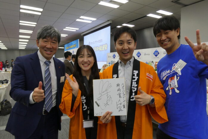 業界挙げてのキャンペーンで、チームワークの良さが目立ったテーブルマークでした。㊧から「三冠受賞!」と喜ぶ吉澤営業本部長、今井さん、東京支社柿崎主任、同飯村課長。