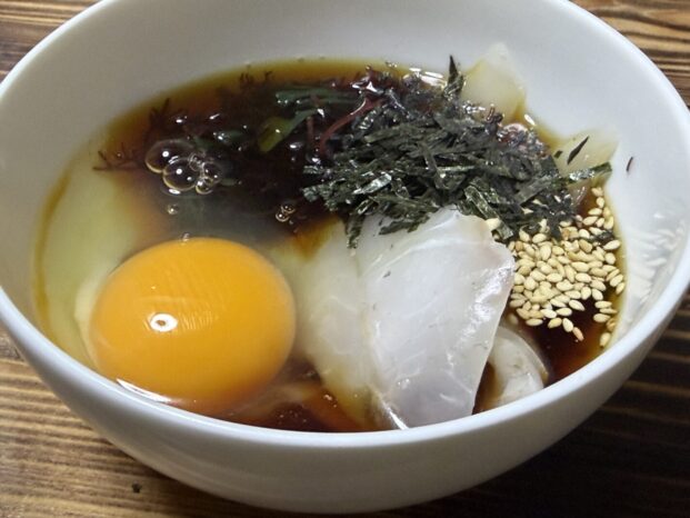 黄金色に輝く秘伝のダシに、生卵を溶き込み、透き通った鯛の刺身をくぐらせる。