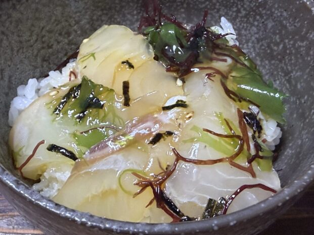 かつて海を支配した伊予水軍の船員たちが、船上で酒を酌み交わした後、残った鯛を醤油に浸し、飯にのせて食ったのが始まりらしい。
