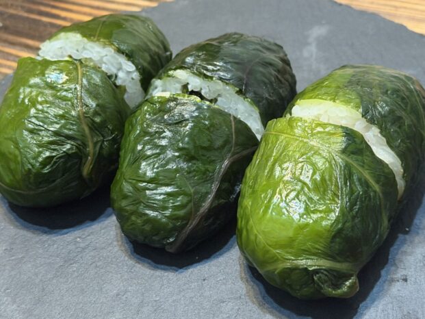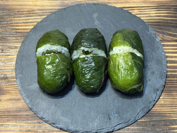 大きな高菜の葉で、一分の隙もなく米を包み込む。