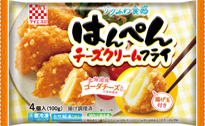 「はんぺんチーズクリームフライ」は、北海道産ゴーダチーズ入りチーズクリームをはんぺんで挟み、サクふわ食感に仕上げたフライ。衣に揚げ玉を付けています。