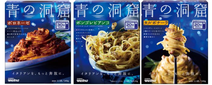 リブランディングした『青の洞窟』の常温製品では、レトルトパスタソース9品がレンジ調理可能にリニューアルされます。