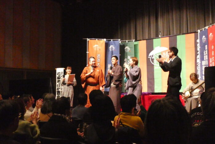 春風亭一蔵さんの文化放送レギュラー番組「ラジオマガジンフライデー」のファンリスナーも多数来場して、大きな声援や拍手も飛び交う中で収録がスタート。古今亭雛菊さんは学生時代に「キンレイ心染プロジェクト」に参加しており、「地方公演もあって、うどんも頂けて嬉しかった」といった思い出も披露しました。
