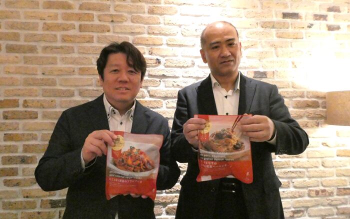 都内の店舗「PASTA & TAPAS PIETRO池袋店」での新商品発表会に臨んだ、ピエトロ商品開発室の中野正浩課長㊧、商品事業本部冷食営業部の滑川剛部長㊨。「辛さばかりでなく旨みをもたせることを大事にしています」と中野課長。ソースへの昆布茶使用はレストランメニューの技だそうです。その根底には、「ごはんに合うものはパスタにも合う」という創業者の発想とのこと。