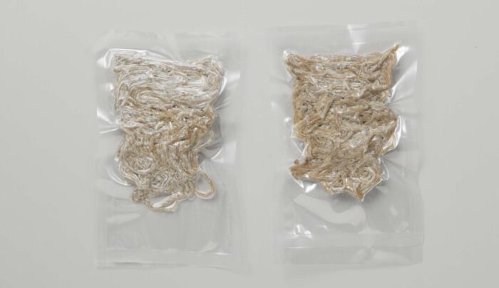 「石垣島のもずく麺」(生冷凍品:170 g=85g×2食)です。SL Creations(エスエルクリエイションズ、本社・東京都大田区、佐藤健社長)が現在開催中の『ご当地フェア』(第一弾)の1品です。国産小麦粉に石垣島の太もずくを練り込んだ麺で、つるもち食感でおいしくいただけます。