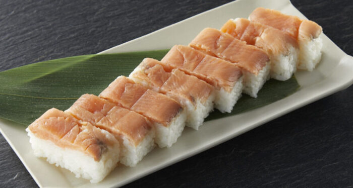 富山からの逸品は、「鱒の押し寿司」(1本260g:8切入り)です。え?お寿司?と驚かれた方、押し寿司をはじめオリジナル冷凍寿司の販売は、SLC年末企画の定番、“お約束”。実績のある商品ジャンルです。今回の新商品は、サクラマスに笹を添えた押し寿司です。
