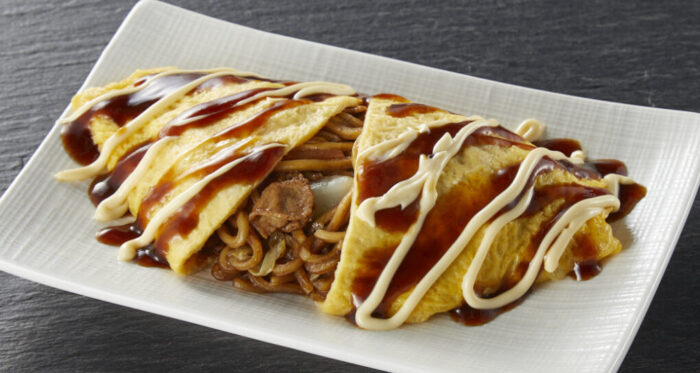 大阪のご当地商品は、「オムそば」(200g)です。2種類のソースを使用して炒めた焼きそばを、玉子焼きでていねいに包んでいます。レンジ解凍ですぐ食べられます。ソース、マヨネーズはご家庭のものでお好みに合わせてトッピングします。