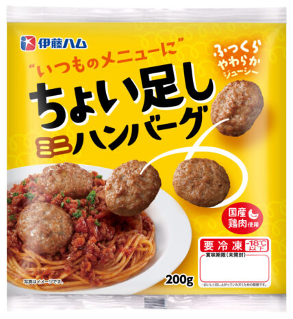 「ちょい足しミニハンバーグは、1個約17gのミニサイズで、商品パッケージ写真のようにパスタメニューや、カレー、オムライスなど日常の食卓メニューに“ちょい足し”できる、使い勝手の良い国産鶏肉使用のハンバーグです。もちろん、そのままハンバーグとして食べても、お弁当に入れてもOK。使いたい分だけ解凍して、ハムや焼豚、ソーセージ代わりに料理の具にしても良いかもしれません。