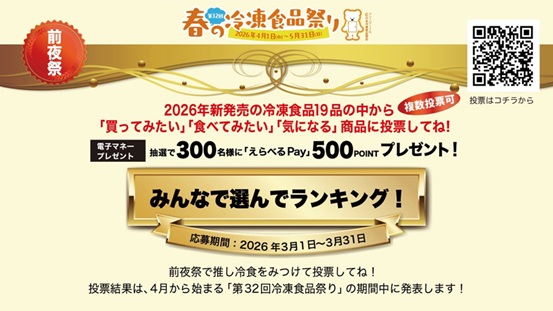 2026年春発売の冷凍食品新商品19品の中から、「買ってみたい」「食べてみたい」「気になる」商品に投票をしてもらうキャンペーンです。投票していただいた方の中から抽選で300名様に、「選べるPay」500ポイントをプレゼント。