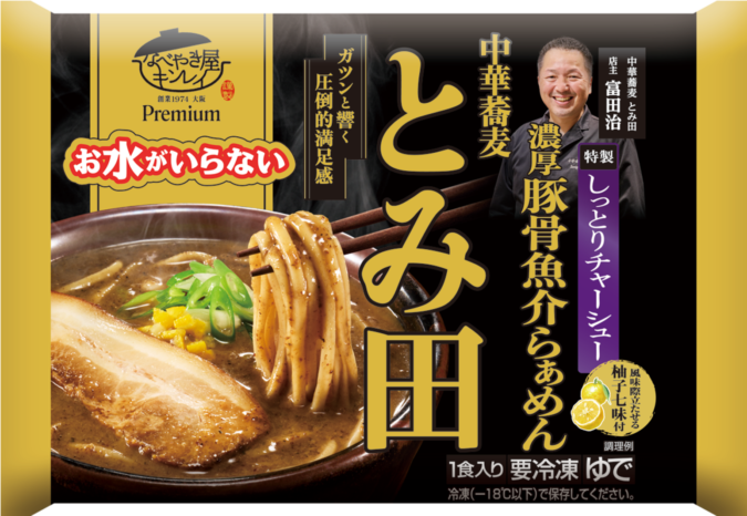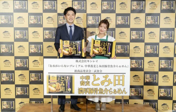 キンレイのプレミアムラーメン、『お水がいらないプレミアム』シリーズの第2弾、3品目は、「お水がいらないプレミアム 中華蕎麦とみ田 濃厚豚骨魚介らぁめん」(1食、474g)。3月5日の発売日に、都内ホールで新商品発表会イベントが開催され、キンレイの大倉孝志企画部マネージャーが新商品を発表。続いてゲストに迎えたタレントの辻希美さんが登壇して、新商品を調理実演して実食。5人のお子様の子育てトークも交えながら、名店の味が家庭で楽しめる喜び、おいしさを紹介しました。